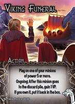 Cards in play are in the middle of the table, i.e., an active base, a card on an active base, or a card on a minion. Cards are in play once they hit the table, even before their ability is resolved. Cards in the hand, deck, discard pile, or set aside, or in the box, are not in play.