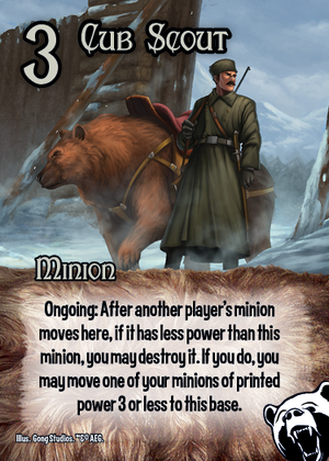 Power 3 - Ongoing: After another player's minion moves here, if it has less power than this minion, you may destroy it. If you do, you may move one of your minions of printed power 3 or less to this base.