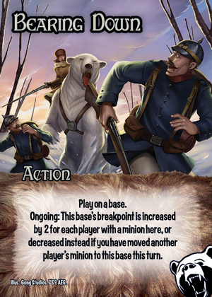 Play on a base. Ongoing: This base's breakpoint is increased by 2 for each player with a minion here, or decreased instead if you have moved another player's minion to this base this turn.