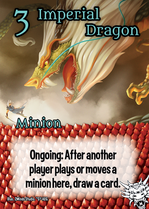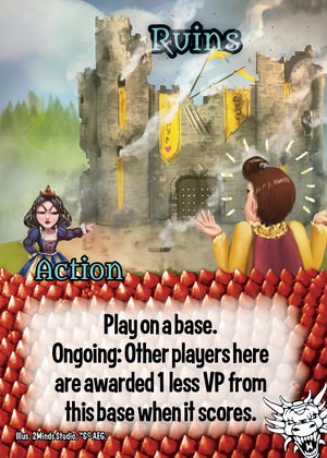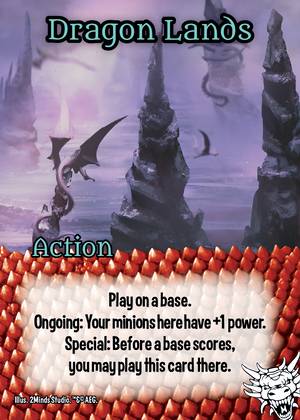 Dragons specialized in ruining other players control over bases and make bases unattractive to other while improving your plays. Their minions Hatchling, and Imperial Dragon give more control over it while reducing theirs and minions like Wyvern can destroy minions and are able to reduce the breakpoints of bases making them easier to capture. Dragons have many actions that can ruin other player action or control of the base. Action such as Dragon Lands, Bring Down the Walls, Intimidating Presence and Dangerous Ground give player more control over bases while making other weaker and action like Raze and Burn it Down give you an ability to destroy an action control over any bases as well. Finally, their best and worst are Ruins and Great Wyrm as they have the ability to reduce the VP score thus reducing the number of point upon capturing a base. Like Tricksters, the downside is that Dragons' abilities can be avoided easily.