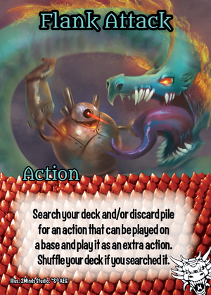 Search your deck and/or discard pile for an action that can be played on a base and play it as an extra action. Shuffle your deck if you searched it.