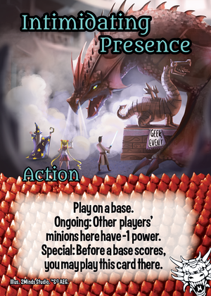 Play on a base. Ongoing: Other players’ minions here have -1 power. Special: Before a base scores, you may play this card there.
