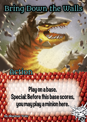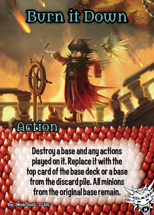 Destroy a base and any actions played on it. Replace it with the top card of the base deck or a base from the discard pile. All minions from the original base remain.
