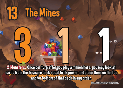 Breakpoint 13 - VPs: 3 1 1 - 2 Monsters. Once per turn after you play a minion here, you may look at cards from the treasure deck equal to its power and place them on the top and/or bottom of that deck in any order.
