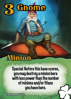 If your opponent won't or can't resist your incursions, then go on the offensive. Claim any particularly advantageous bases for yourself, then when it appears your opponent won't play there, follow where they went with your Gremlins, Brownies, and Leprechaun. You want to invade bases where your opponent is and try to stop them from playing any more power there than you, so you won't have to play as much there yourself to break the base and win it. Gnomes can be used here to keep the balance of power on the base under control. Once you've got Enshrouding Mist ready, drop two minions and win the base.